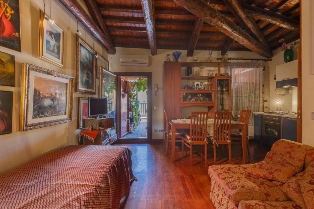 Una scala interna conduce al secondo e ultimo piano, dove le capriate a vista conferiscono all'ambiente un fascino architettonico inconfondibile. Qui il soggiorno con cucina a vista si apre su una terrazza al piano di circa 20 mq affacciata sul campo, privilegio raro nel contesto veneziano. Scendendo tre gradini dal livello del soggiorno, si accede a un'ulteriore camera da letto e al bagno padronale.