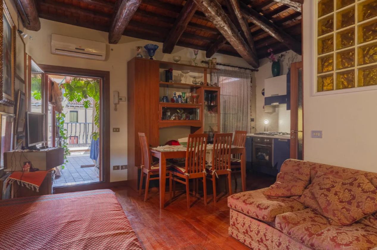 Una scala interna conduce al secondo e ultimo piano, dove le capriate a vista conferiscono all'ambiente un fascino architettonico inconfondibile. Qui il soggiorno con cucina a vista si apre su una terrazza al piano di circa 20 mq affacciata sul campo, privilegio raro nel contesto veneziano. Scendendo tre gradini dal livello del soggiorno, si accede a un'ulteriore camera da letto e al bagno padronale.